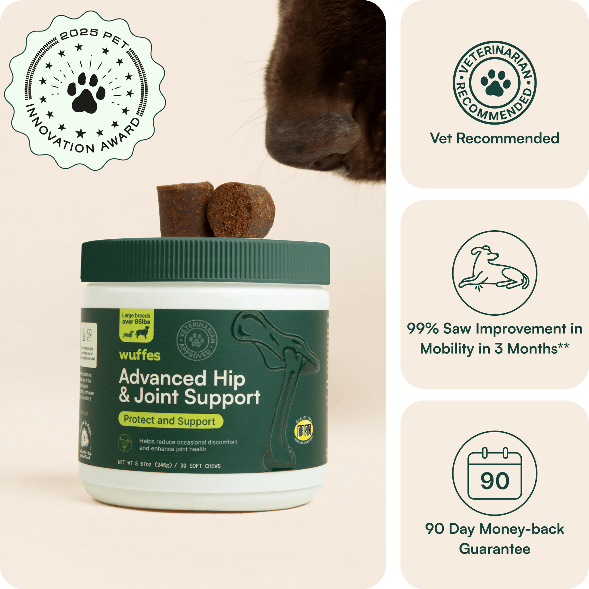 Choose between our Advanced Hip & Joint Support chews and Advanced Joint Liquid based on your pup’s preferences and levels of discomfort. They’re highly concentrated to protect and actively enhance bone & joint health.